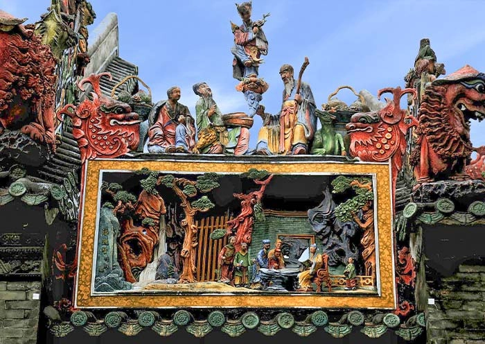 The Cantonese Opera Performance is another highlight of the Ancestral Temple as it is an important Lingnan culture that even affects Lingnan Architecture. Originating in Foshan, Cantonese opera is listed in the Representative List of the Intangible Cultural Heritage of Humanity by UNESCO. You can watch the opera in Wanfutai Ancient Stage on festive occasions. With a history of more than 300 years (since 1685), the stage not only witnessed the long history of Cantonese opera but also reminded us why there are Cantonese opera scenes in Lingnan Architecture. You may notice the photo in your ticket of the Ancestors’ Temple and remember the architectural ridge tile on the three gates (三门) which is decorated with Shiwan ceramics of characters and immortals, birds, beasts, insects, fish, miniature bonsai, vegetables, fruits, and utensils… Built in 1450, it is a magnificent 31.7-meter-long and 1.78-meter-high ridge featuring 152 pottery figures, making it the longest surviving ridge tile in China. It is renowned as the “King of the Ridge Tile“. The pottery figures are slightly tilted forward to facilitate viewing from below. You can even discover scenes from traditional Cantonese opera performances, such as the Cowherd and Weaver Girl (牛郎织女), Nezha’s Battle in the Seas (哪吒闹海), and Mu Guiying Taking Command (穆桂英挂帅). These architectural ridge tiles represent a unique form of decorative art in Lingnan architecture during the Ming and Qing dynasties and are closely related to the popular Cantonese opera art of that time. Incorporating excerpts from Cantonese opera onto the ridge decorations reflects the passion of the people of Shiwan Town for Cantonese opera and represents a significant artistic innovation by the pottery sculptors of Shiwan.