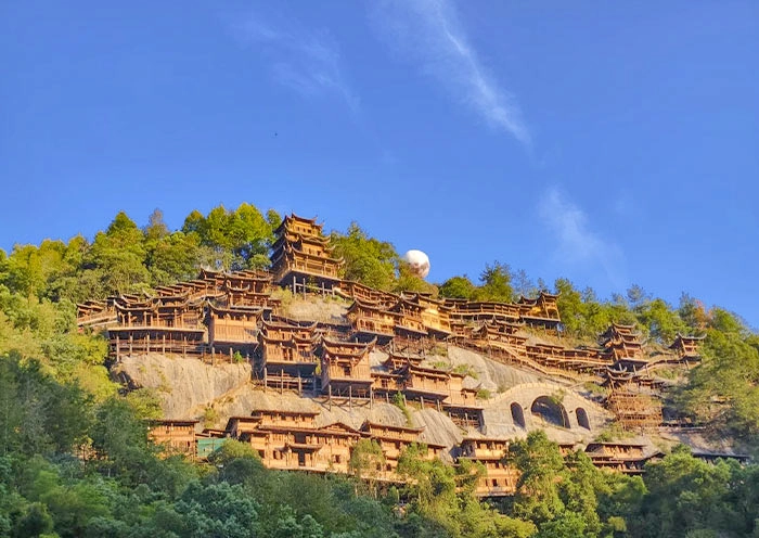 As dusk settles and the lights begin to glow, the contours of the cliffside buildings In Wangxian Valley become clearly outlined in warm, soft light. The entire mountain cliff transforms, seemingly a “Heavenly Palace on Cloud Nine” descended from a myth.