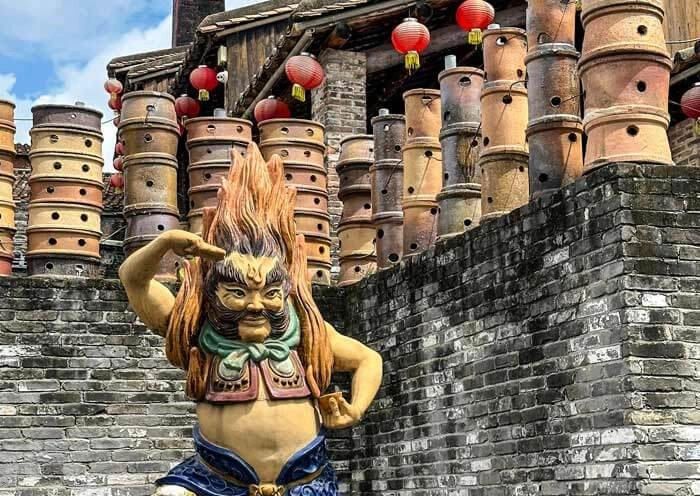 After breakfast, head to Nanfeng Ancient Kiln (南风古灶) in Shiwan Town, an important pottery base in Ling Nan. The tall chimney is a landmark here. Foshan is known as the “Pottery Capital of the South” (南国陶都) and Shiwan ceramics (石湾陶瓷) are the shining gem in the crown of Foshan ceramics. The Nanfeng Ancient Kiln, known as the “Living Fossil of Ceramics“(陶瓷活化石), stands as the best witness to the long-standing ceramic culture in Shiwan Town (石湾镇). During the Qing Dynasty, the heyday of Shiwan ceramics, there were a total of 107 dragon kilns (Long Kiln龙窑), of which only three remain today. Built between 1506 and 1521, Nanfeng Ancient Kiln is the oldest and only wood-fired ancient dragon kiln still in operation. It has been continuously producing ceramics for over 500 years and is listed in the Guinness World Records. You will see the dragon kilns built on the slopes, like dragons descending from the sky, which is why the locals call them “dragon kilns“. And, you can not only climb the stairs and enter the kiln but also learn about the ceramic-making process. The ceramics produced by the folk kilns in Shiwan Town, represented by Nanfeng Ancient Kiln, cover a wide range of categories, which were popular throughout the Pearl River Delta region and around Asia. At that time, various household utensils such as basins, sugar jars, and ridge ornaments for roofs (such as those seen in the Chen Clan Ancestral Hall) were in high demand, as well as flower pots, glazed tiles, and ridge tile (flower ridges瓦脊/花脊) for garden ceramics. They were all popular and had excellent export volumes, second only to Jingdezhen (景德镇) in Jiangxi Province. Surprisingly, there is a 400-year-old banyan tree standing at the end of the Nanfeng kiln, unaffected by the kiln’s temperatures exceeding 1,000 degrees Celsius.