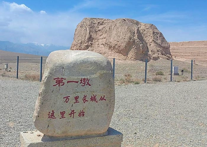 2. The First Outpost of the Great Wall (长城第一墩; Self-pay):Located on the way to Dunhuang, the First Outpost of the Great Wall, standing about 10 m high, rises on a cliff about 56 m high near the Taolai River (讨赖河). It is the westernmost platform of the Ming Dynasty Great Wall (墩台; ancient military communication spot). You can witness the historical relics in their original state. With a little walk, you will discover an ancient military camp by the river valley where you can immerse yourself in the harsh lives of the frontier soldiers of that era.