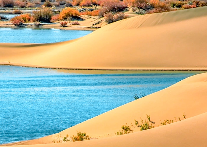 The reference route on this day can be the Eastern Route: visiting the Sand Geopark Museum and various stunning desert lakes, such as Dagetu (Red Lake), Yinde Ritu (Divine Spring), and Bilutu (Pearl Peak). The day concludes with an overnight stay near Suming Jilin (Temple Lake).
